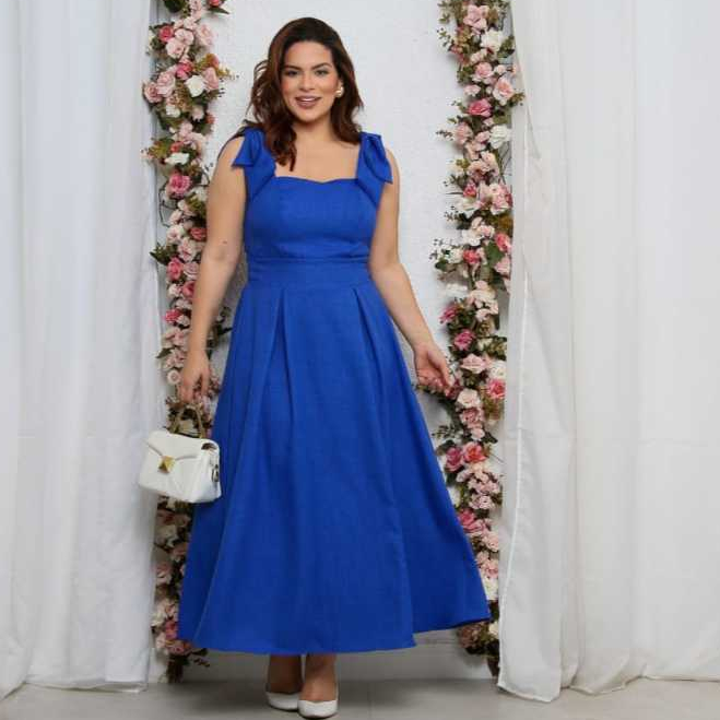 Vestido Mídi Elegante Social Laço Plus Size Moda Feminino Tecido Linho Com Lastex