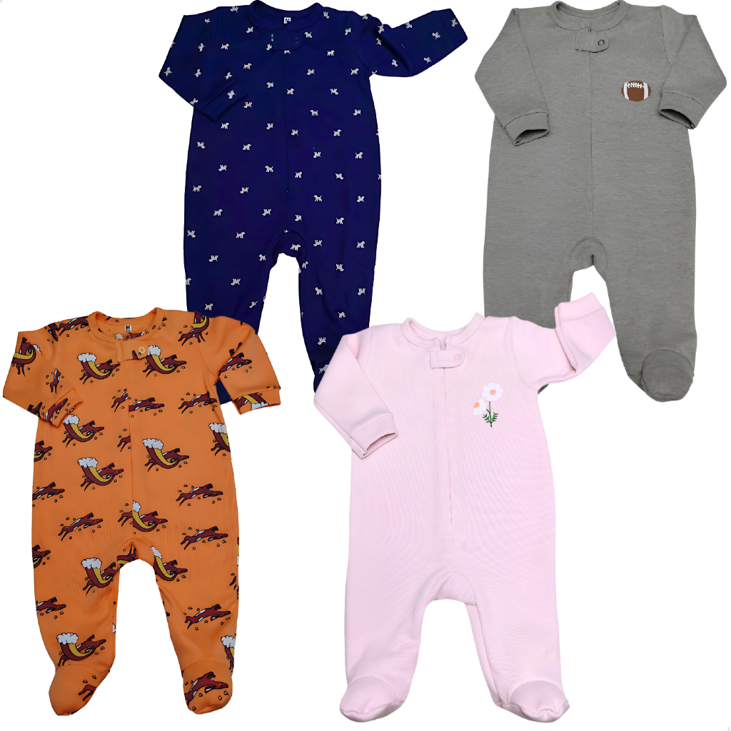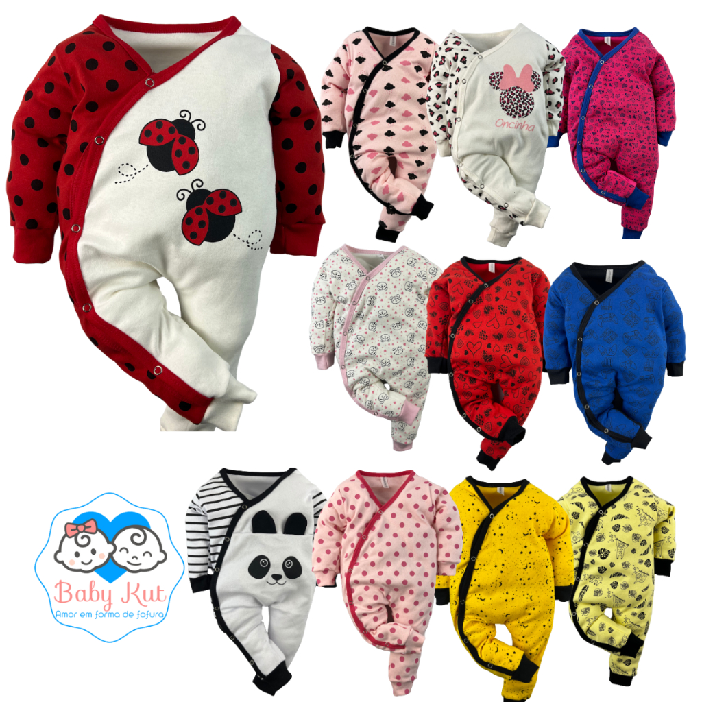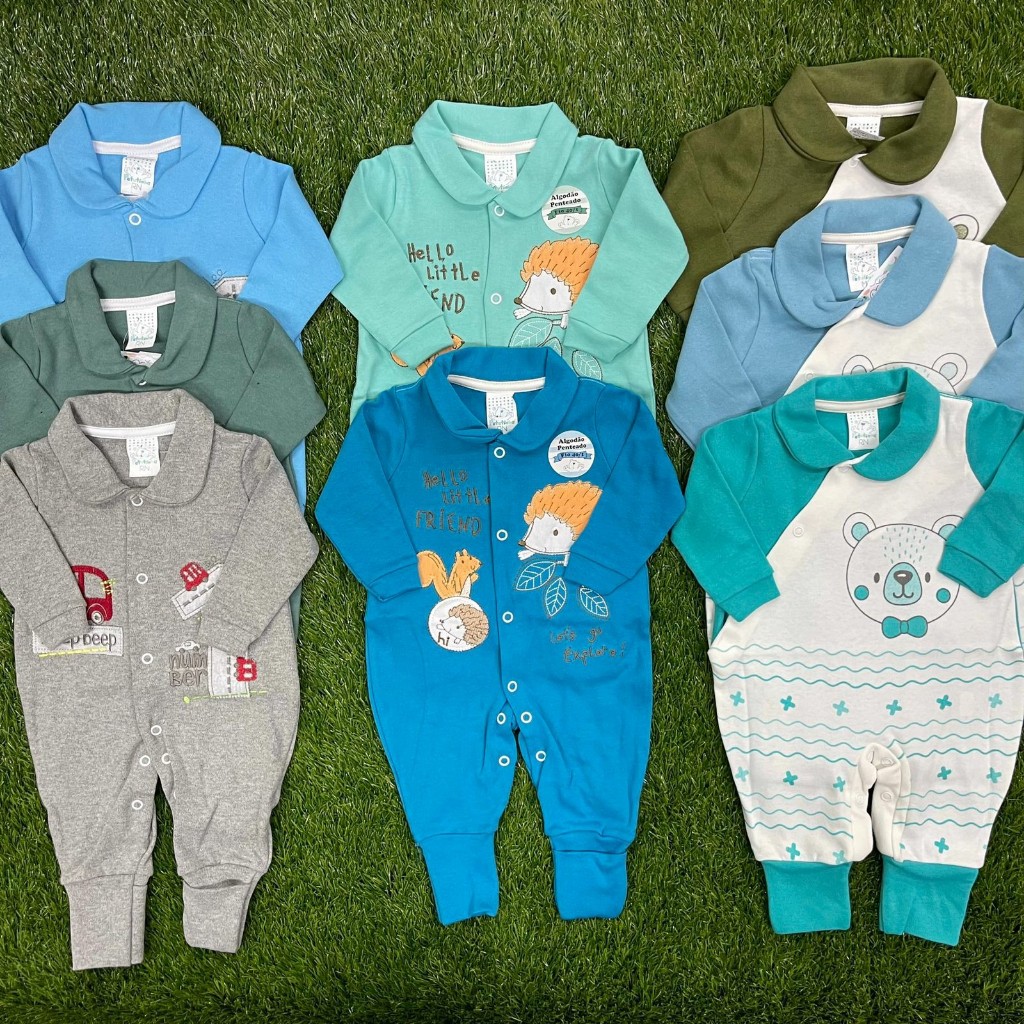 Macacão para Bebês, Crianças e Recém Nascidos (RN) 100% Malha Penteada de Algodão com Vira Pé e Manga Longa