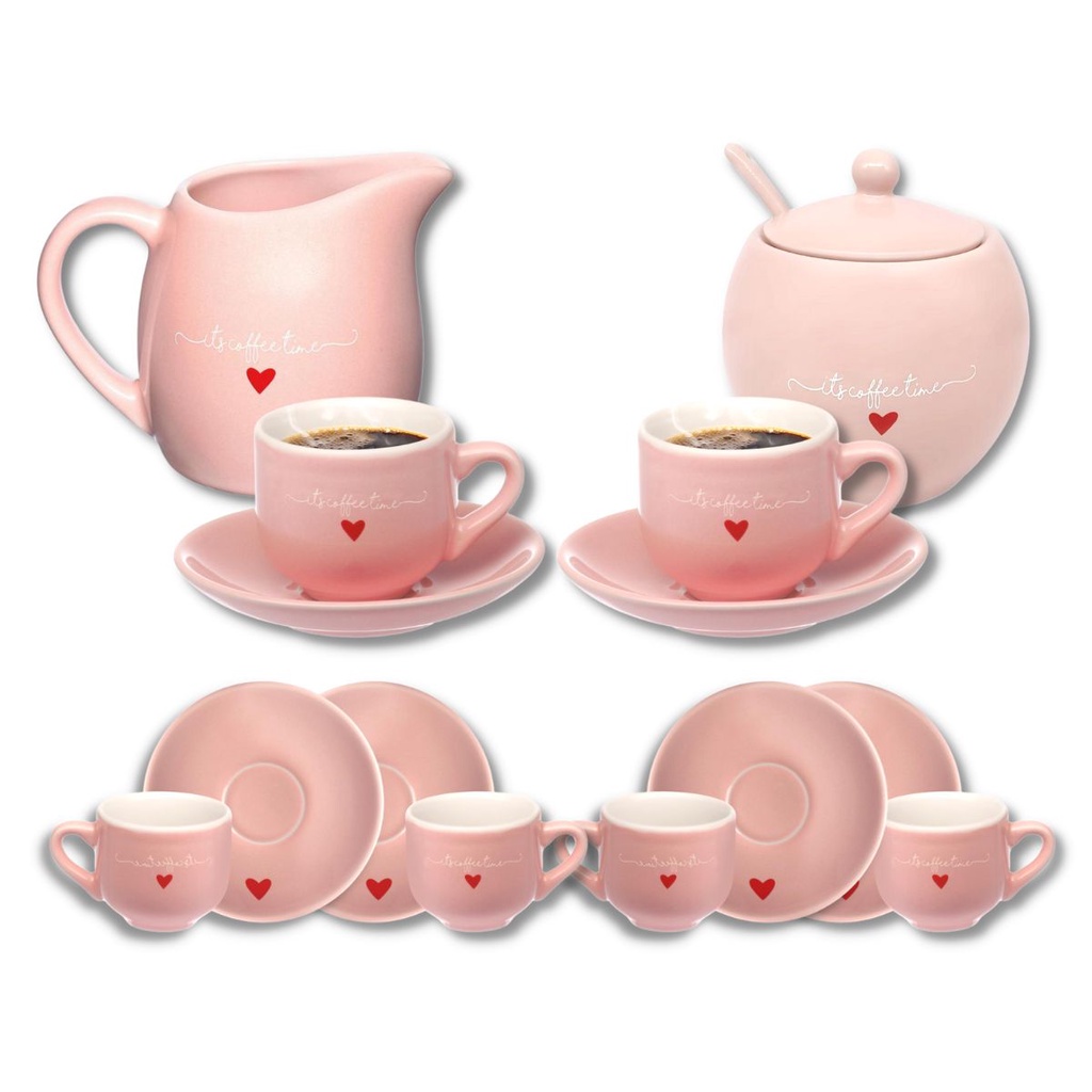 Jogo de Xicaras com Leiteira e Açucareiro Porcelana Hauskraft Lamour Rosa 14 Peças
