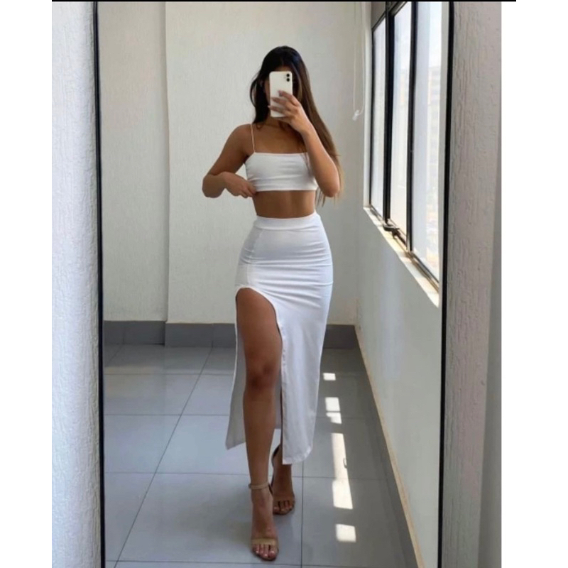 Conjunto Olívia saia longa com fenda e cropped suplex / Canelado Branco gringa Olívia ll