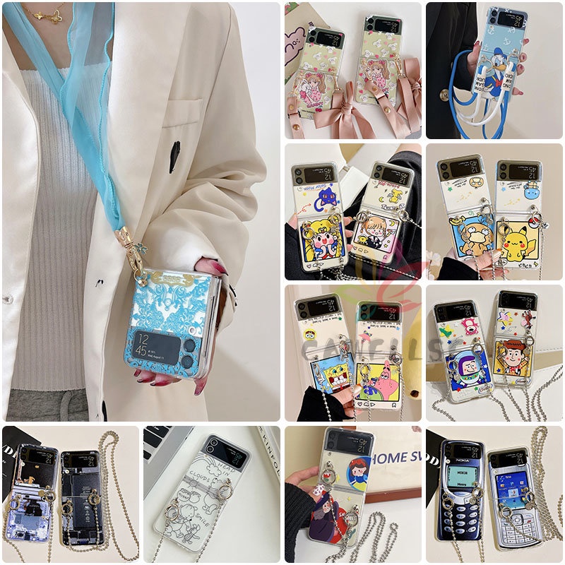 Lindo Desenho Animado Colar De PC Rígido Corrente De Ombro Caixa De Telefone Samsung Galaxy Z Flip 4 5G ZFlip3 Zflip4 Capa Transparente À Prova De Choque