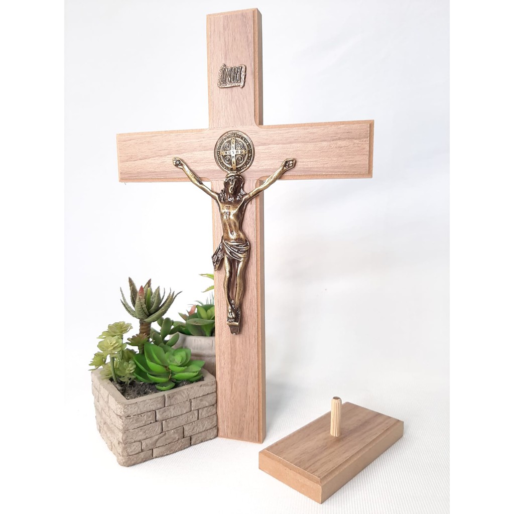 Cruz Crucifixo de Madeira com Bronze com Cristo e Medalha de São Bento - 33,5cm com suporte Parede ou Base em Pé