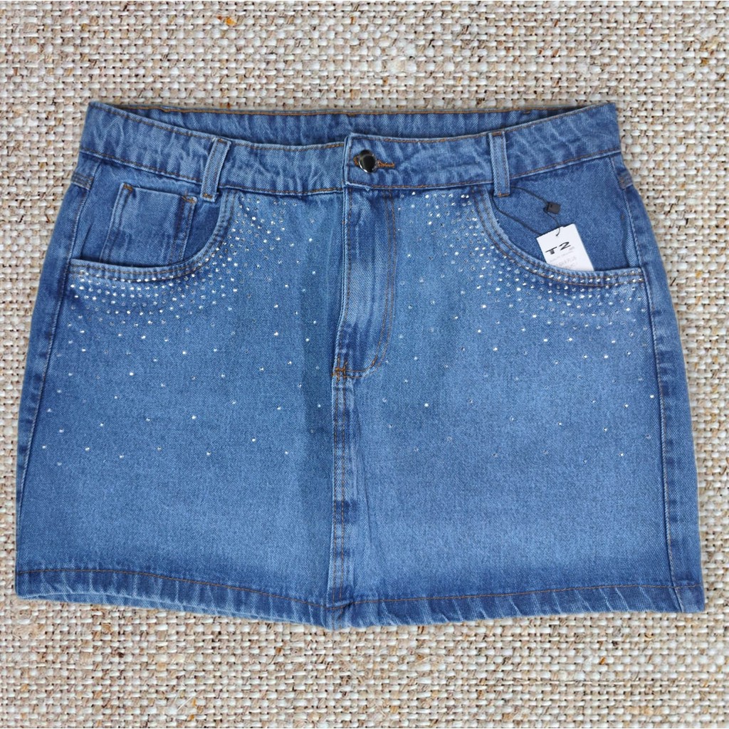 Saia Jeans Feminina Plus Size Pedrarias Em Brilhos Nos Bolsos Cintura Alta Sem Lycra Mini Saia Azul