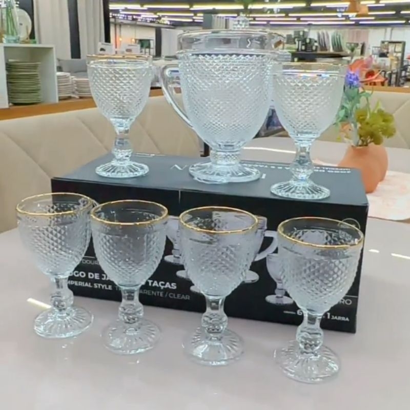 Jogo de Jarra e 6 taças imperial styleVIDRO transparente Vcom borda dourada