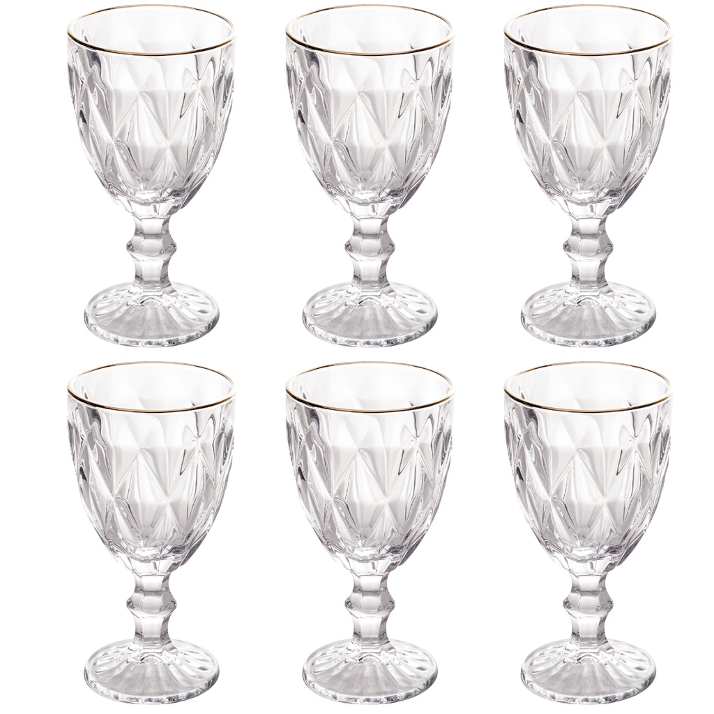 Jogo com 6 Taças Diamond ou bico abacaxi Transparente com Borda Dourada 300ml