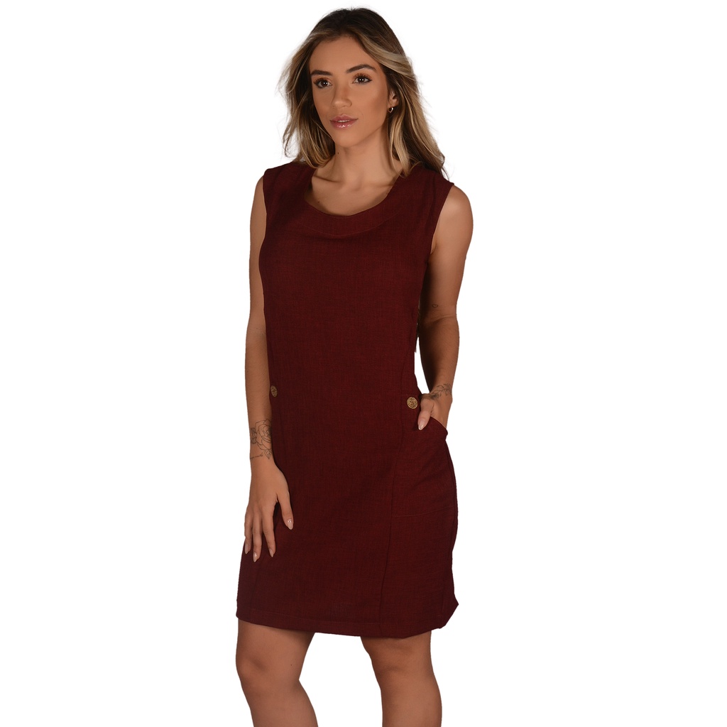 VESTIDO DE LINHO FEMININO COM BOLSO E BOTÃO- VAEV MODAS-