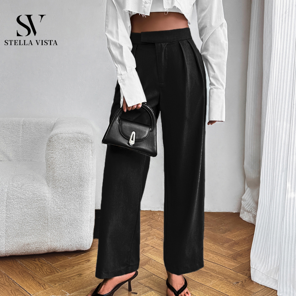 SV Calça alfaiataria feminina preta, calça pantalona de alfaiataria, com design de cintura irregular e bolsos.