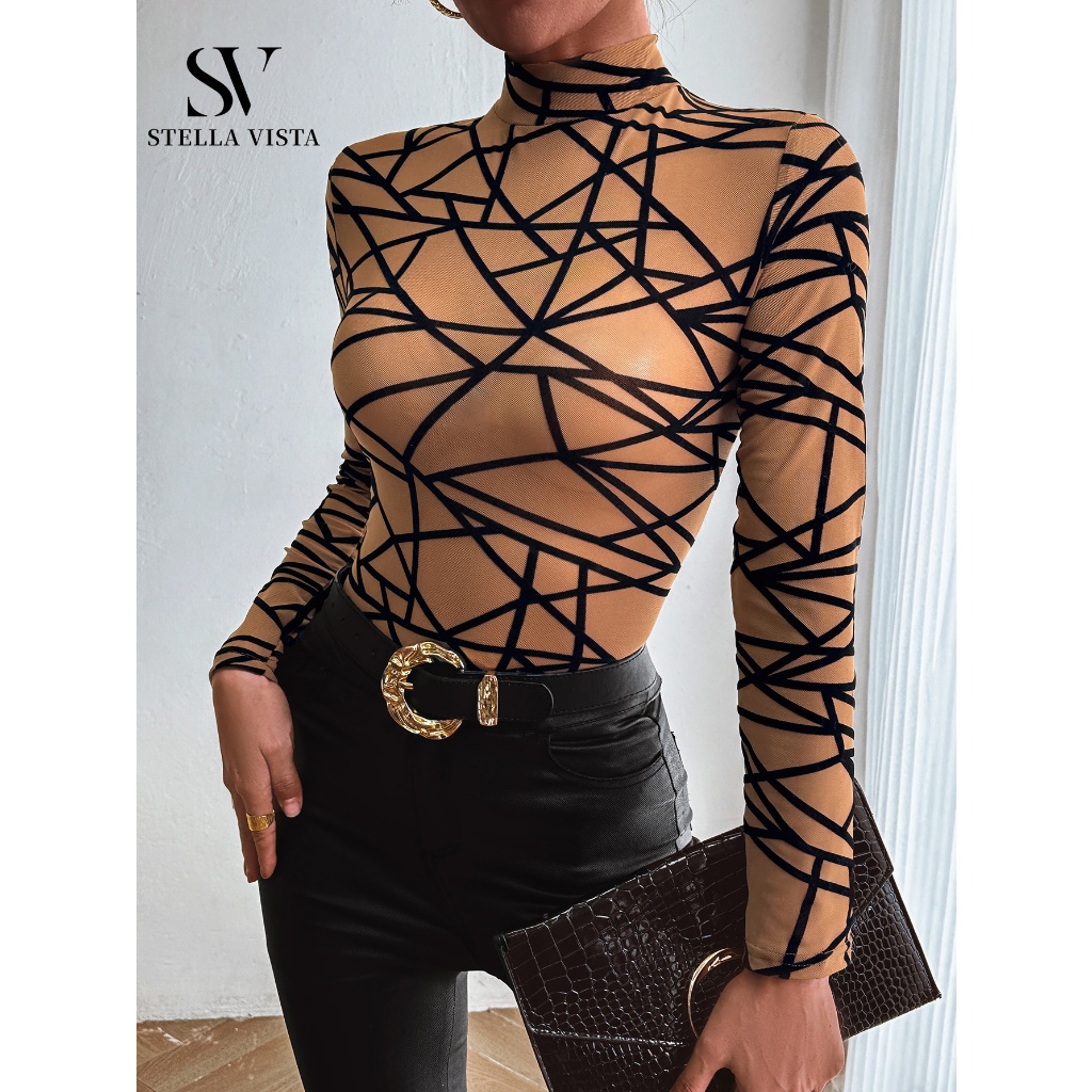 SV Camiseta feminina de manga longa justa, elegante com gola alta de tule, tecido de renda felpuda, padrão de losango.