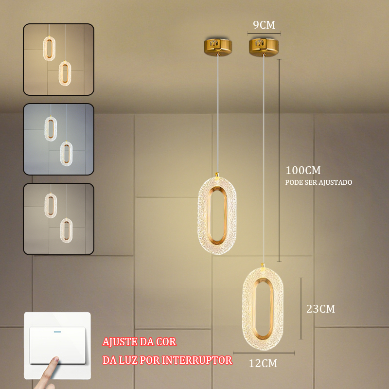 Kit 2 Pingente De Cristal Oval Moderno Elipse Ouro 7w Bivolt 3 Cores 110V-220V
