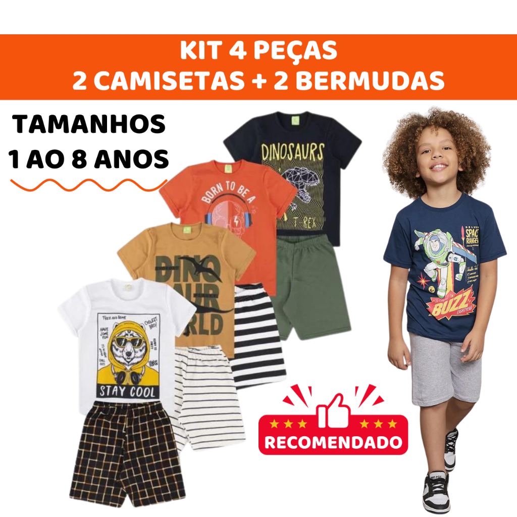 Kit 4 Peças de Roupa Infantil Menino 2 Camisetas + 2 Bermudas