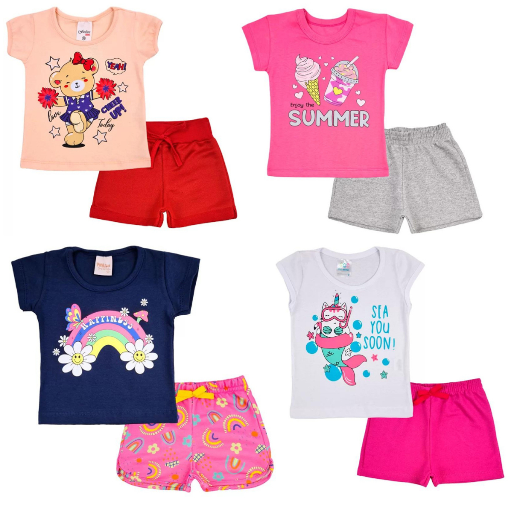 Kit Sortido 4 Peças de Roupas Infantil Menina - 2 Camisetas + 2 Bermudas - Promoção - Kit com 2 Conjuntos de Roupa Infantil Menina