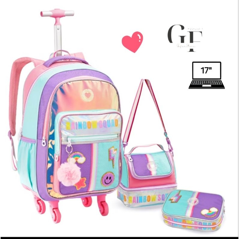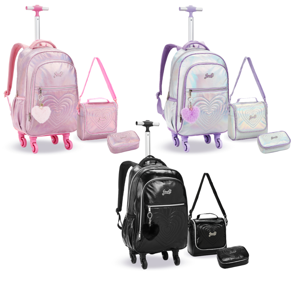 Kit Mochila De Rodinha Infantil Menina Escolar Com Chaveiro Pompom Feminina + Lancheira Térmica + Estojo - Seanite