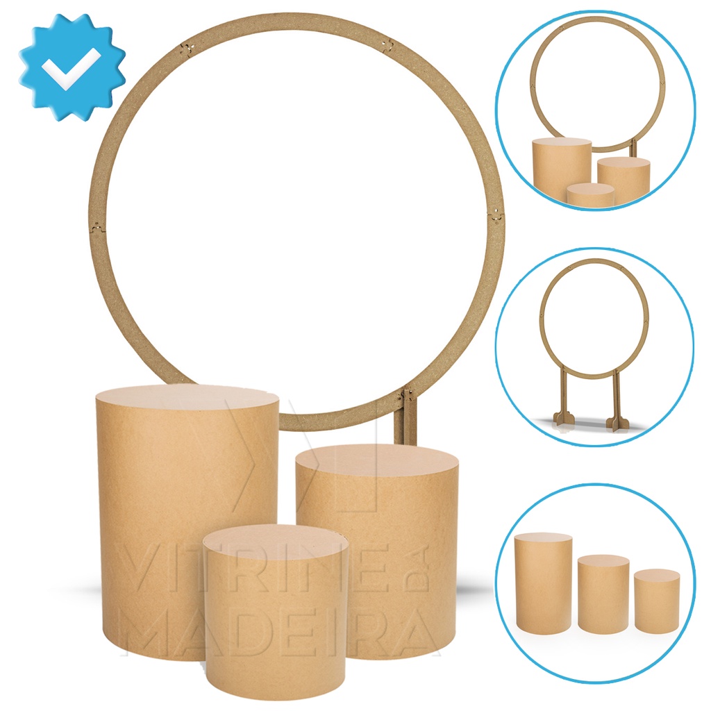 Conjunto Painel Redondo Grande e Trio de Cilindro Mdf Cru Para Festas