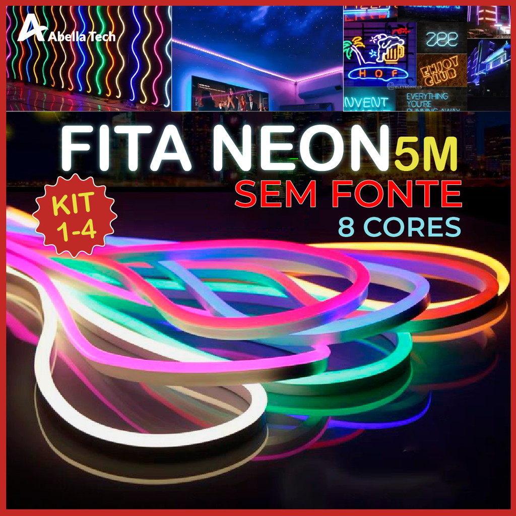 Kit 4 Fita de LED Mangueira Neon 5 Metros 60W Flexível Com Fonte 12V | 8 Cores