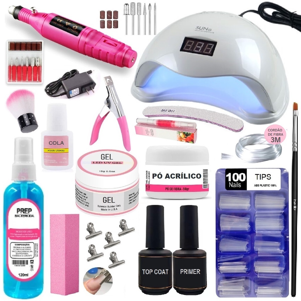 Kit Alongamento de Unha Gel Lixa Lixadeira Motor Completo Acrigel Manicure Top e Primer Fibra Cabine Sun 5 Unhas Gel Manicure