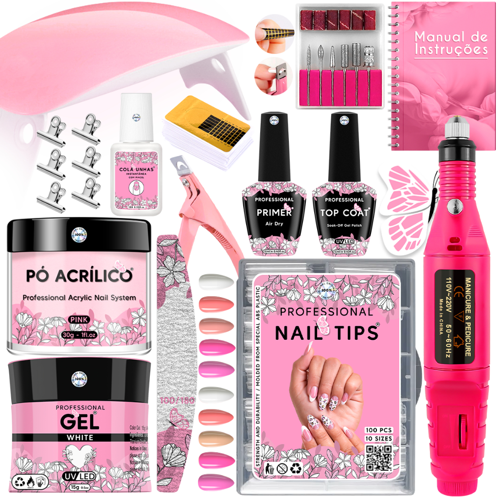 Kit Manicure Iniciante Unha Completo Gel Acrigel Acrílico Fibra Porcelana de Unhas Cabine Estufa Sun Mini Lixa Lixadeira