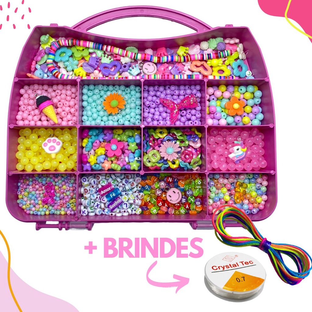 Kit Miçanga Infantil Para Pulseira Colar e Brincos 1200 Peças Maleta Miçangas