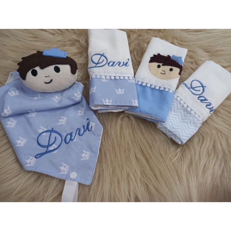 kit Fralda de boca 3 paninhos bordados com bichinhos e Naninha bichinhos PERSONALIZADOS com nome