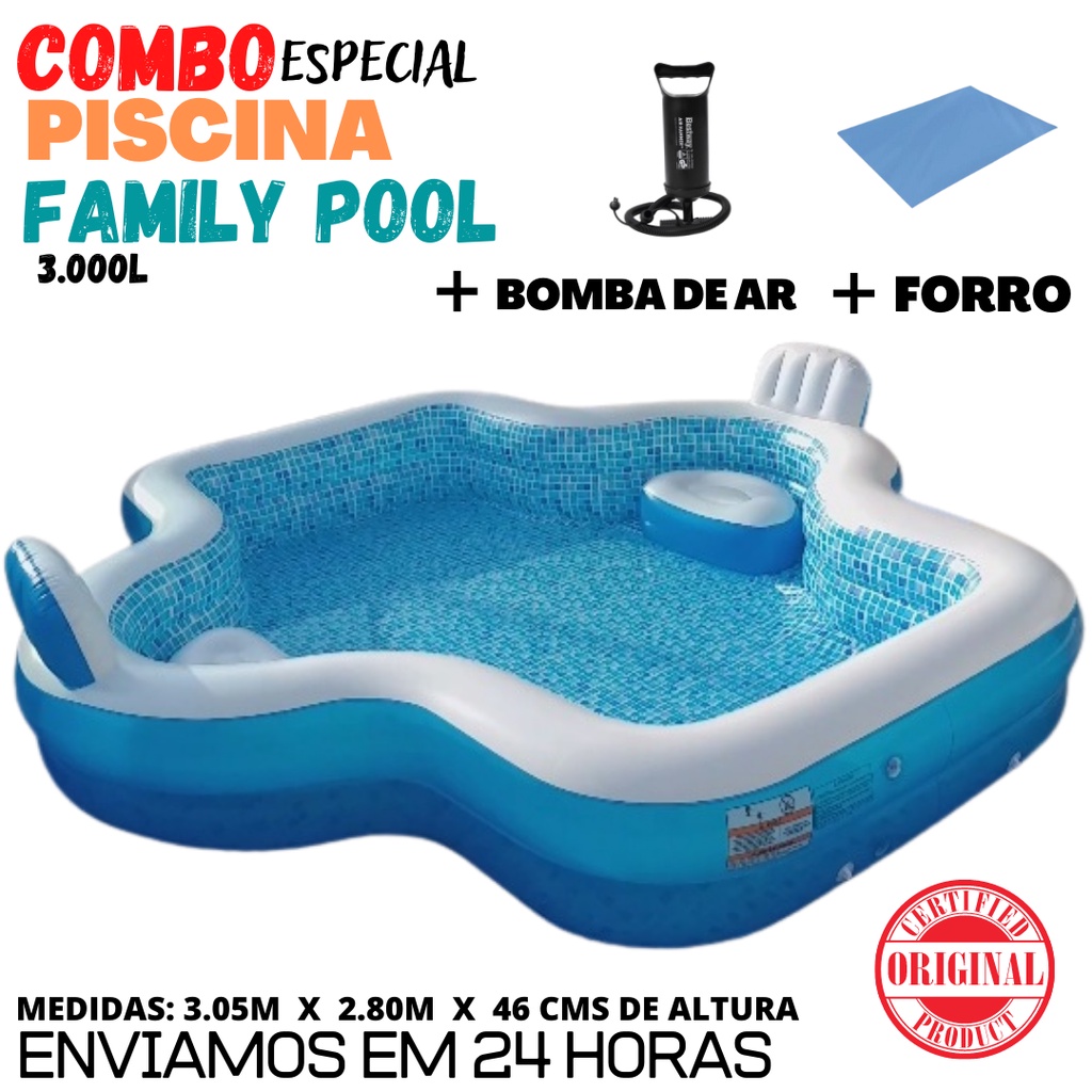 Piscina Família Premium 3.000 L c/ Assentos e Encostos - Family Pool Acompanha Forro e Bomba de ar.