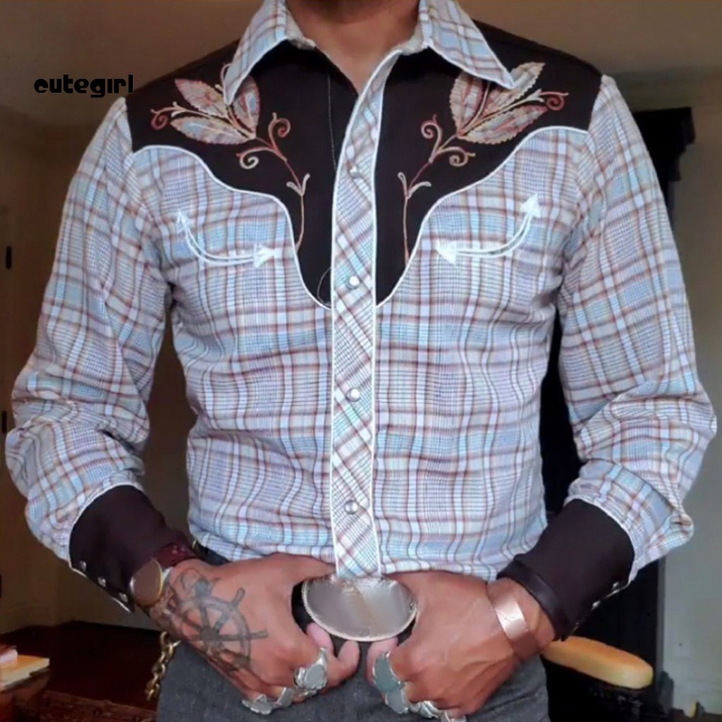 CGM-Men Spring Shirt Vintage Western Cowboy Impressão De Manga Comprida Com Um Peito Slim Fit