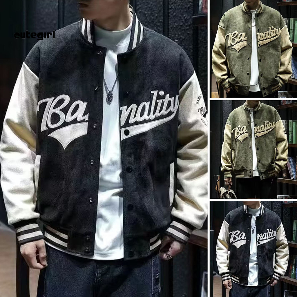 CGM-Men . Casaco De Baseball De Camurça Colarinho De Manga Comprida Bolsos Laterais Peito Simples