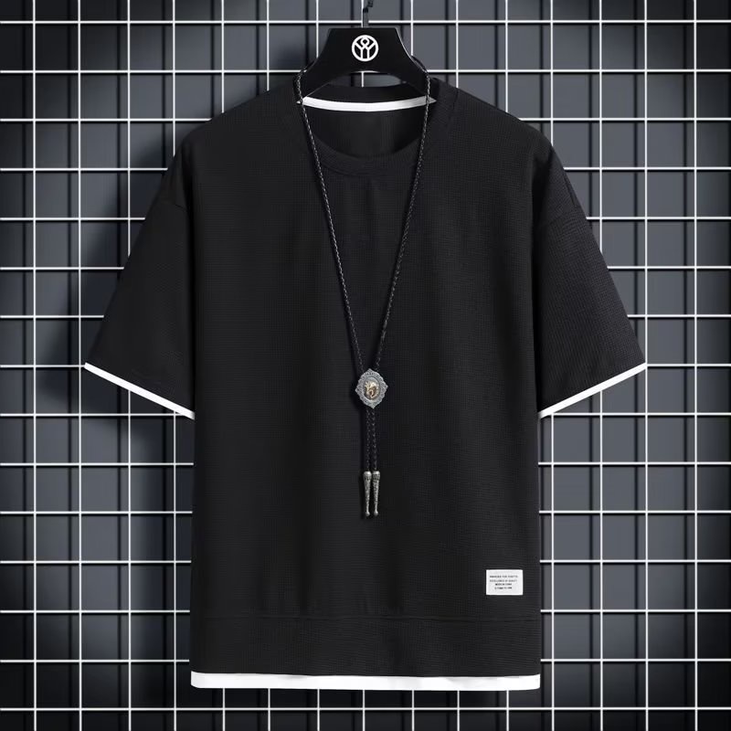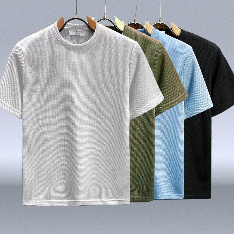 Camiseta Summer loose short sleeve waffle T-shirt De Manga Curta Solta Estilo Coreano Masculino Moda casual Crew neck Tops Toda Em Seção Fina Respirável Jovem Pescoço Redondo Ajustado Plain Tshirt