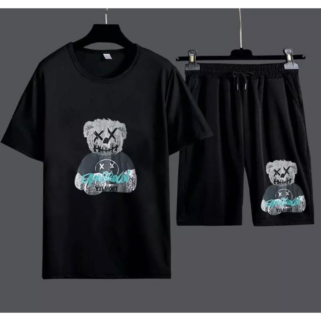 Conjunto Camiseta Básica Urso Basquete Masculina Algodão StreetWear Bermuda Urso Basquete Moletom com Bolso