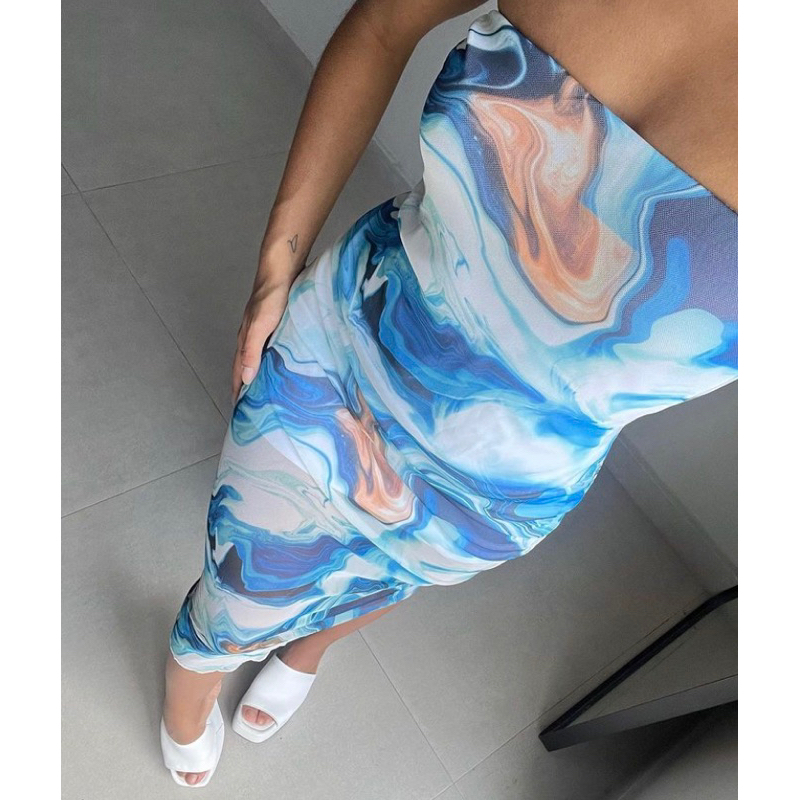 Vestido midi faixa tomara que caia em tule psicodélico estampado em alta verão moda blogueira transparência