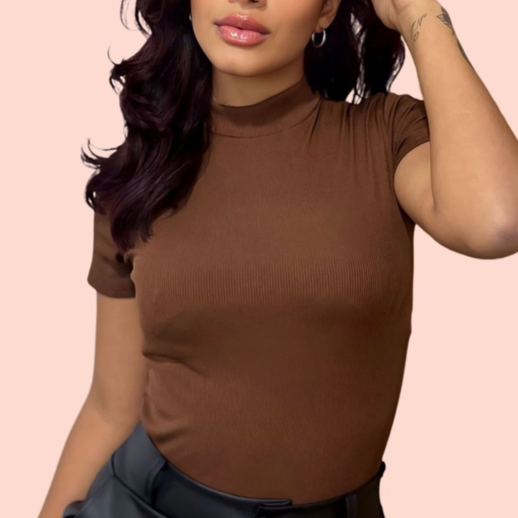 Blusa Feminina Basica Camisa Canelada Gola Alta T-shirt Manga Curta