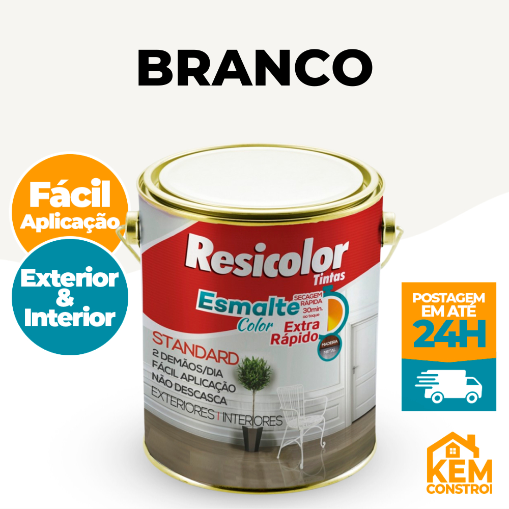 Tinta Esmalte Sintetico Brilho Standard para Madeira Ferro latão Interior e Exterior Esmalte Brilho Galao Branco 3,6 Litros Resicolor
