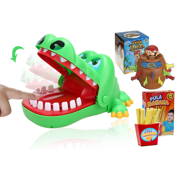 BRINQUEDO INFANTIL CROCODILO DENTISTA MORDE DEDO JACARÉ APERTA DENTE ORIGINAL GRANDE JOGO INTERATIVO DE MESA TABULEIRO EDUCATIVO KIT PARA CRIANÇA PULA PIRATA + PULA BATATA + PINGUIM QUEBRA GELO + TIRA VARETAS + QUEM SOU EU MENINO MENINA