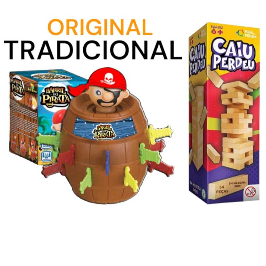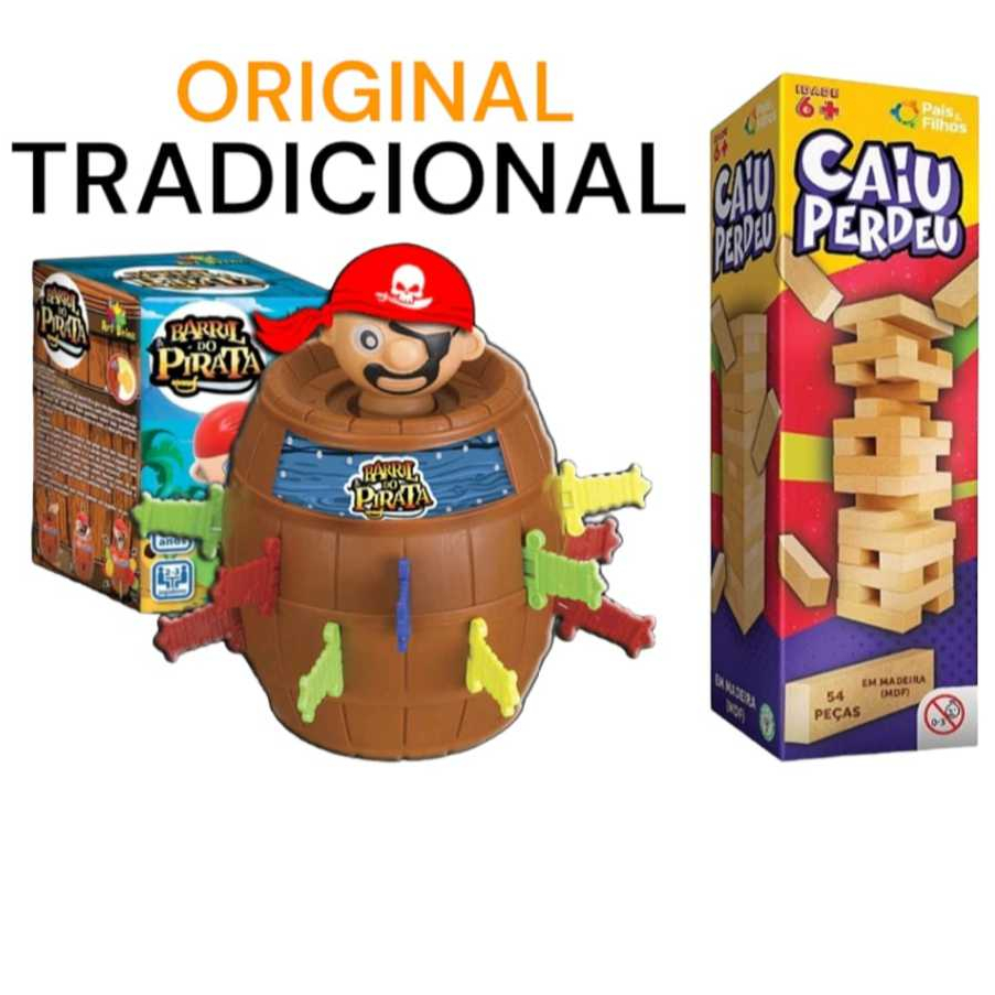 BRINQUEDO INFANTIL BARRIL PIRATA ORIGINAL GRANDE JOGO INTERATIVO DE MESA TABULEIRO EDUCATIVO KIT PARA CRIANÇA PULA PIRATA + PULA BATATA + PINGUIM QUEBRA GELO + TIRA VARETAS + QUEM SOU EU MENINO MENINA