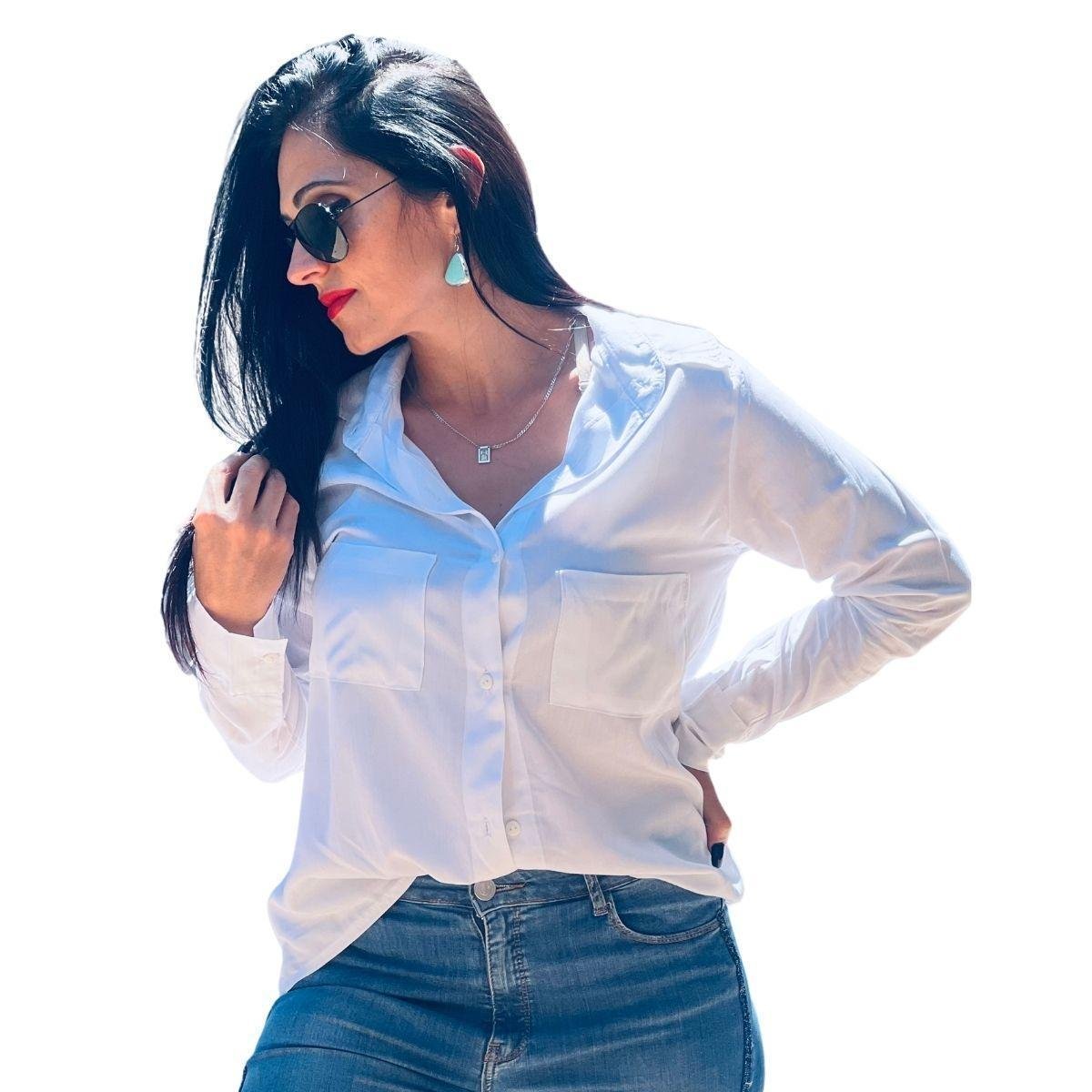 Camisa Camisete Feminina Social Manga Longa Blusa De Botão Com 2 Bolsos