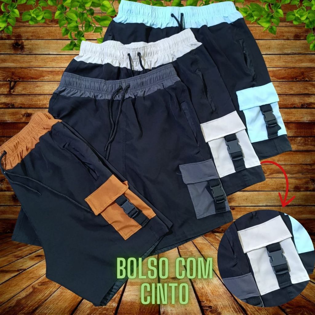 kit com 3 bermudas tactel elastano premium short cargo masculino bolso cinto academia praia streetwear
