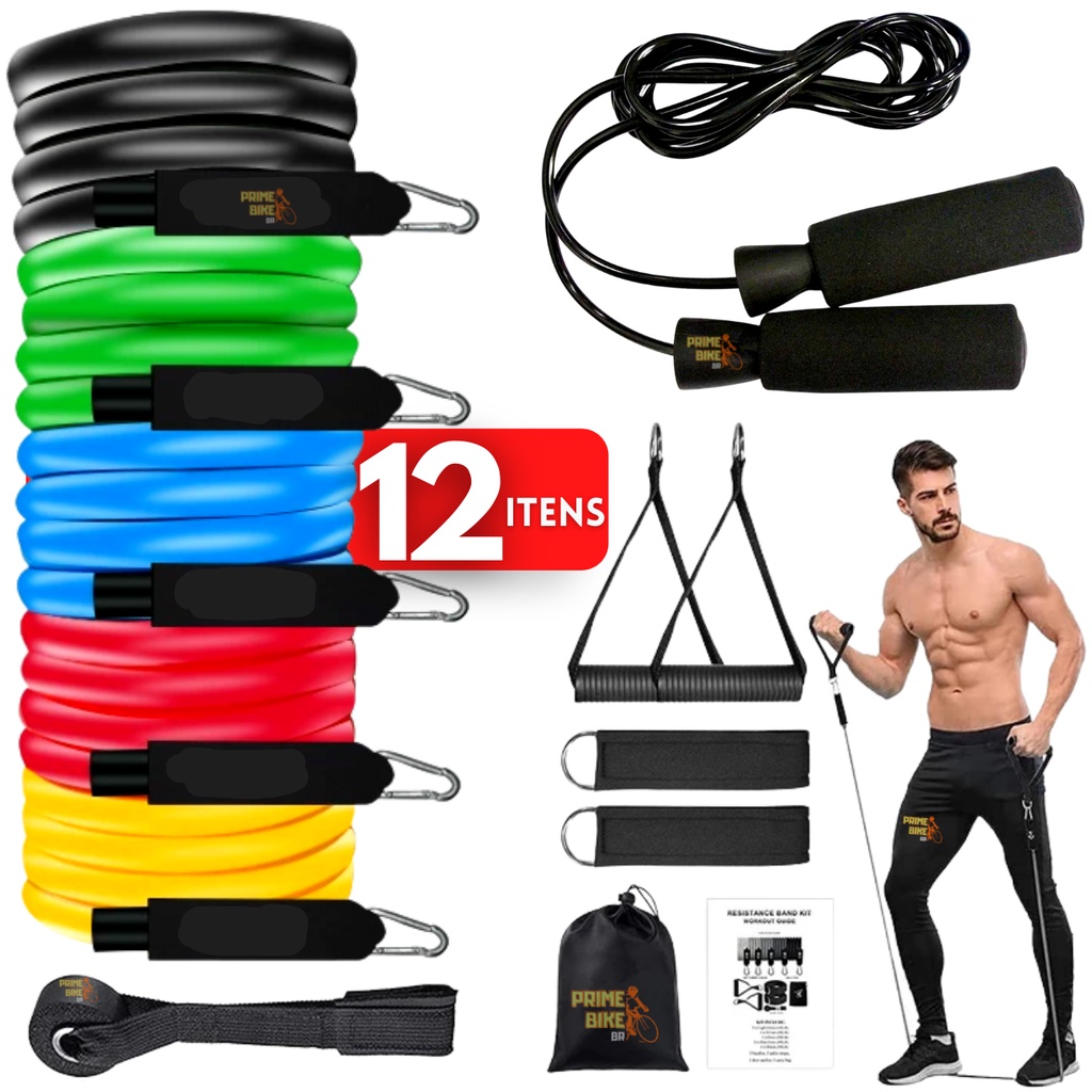 Kit Elástico Treino Extensor + Corda de Pular Crossfit Exercício Funcional Academia em Casa 12 Itens Fisioterapia