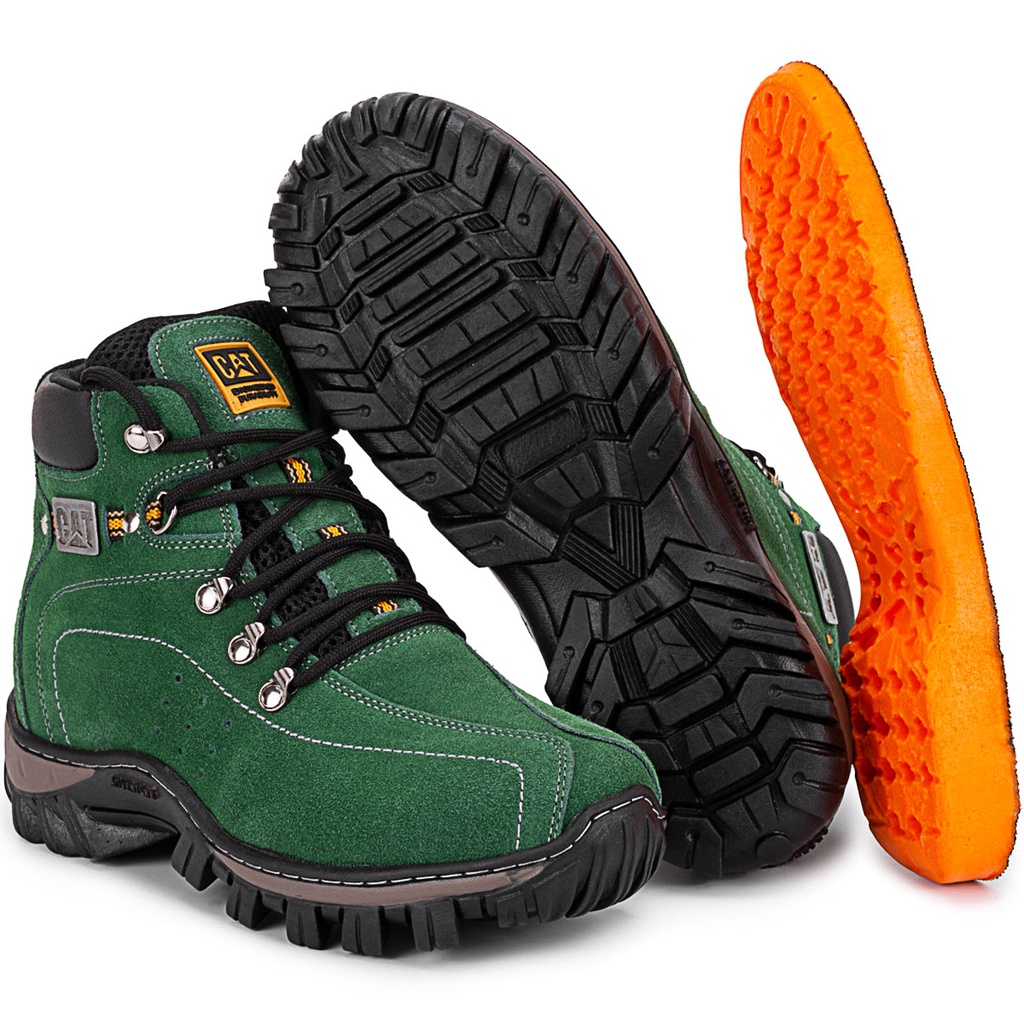 Kit Bota Coturno Caterpillar Confortável Couro Verde Resistente Palmilha Gel.
