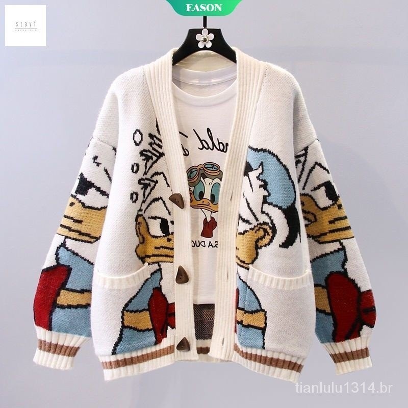 2023 Outono E Inverno Novo Vento Preguiçoso Disney Donald Japonês Pato Casaco Camisola das Mulheres Versátil Grosso Cardigan Capuzes