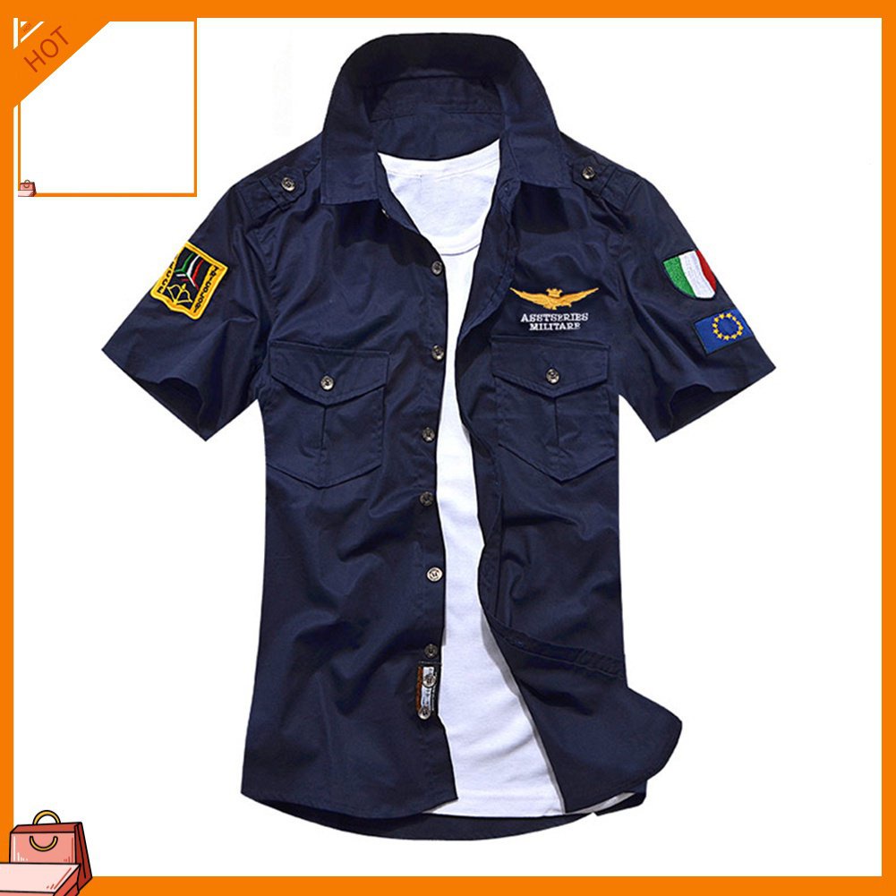 [EDG] Militar Homens Carta Bordado Bolso Slim Down Botão Camisa de Manga Curta EZ8E