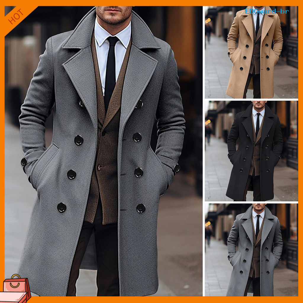 [EDG] Homens Casaco De Lã Longo Lapela Manga Sólida Bolsos Quebra-Ventos Cor Duplo Peito Meio Comprimento Outwear