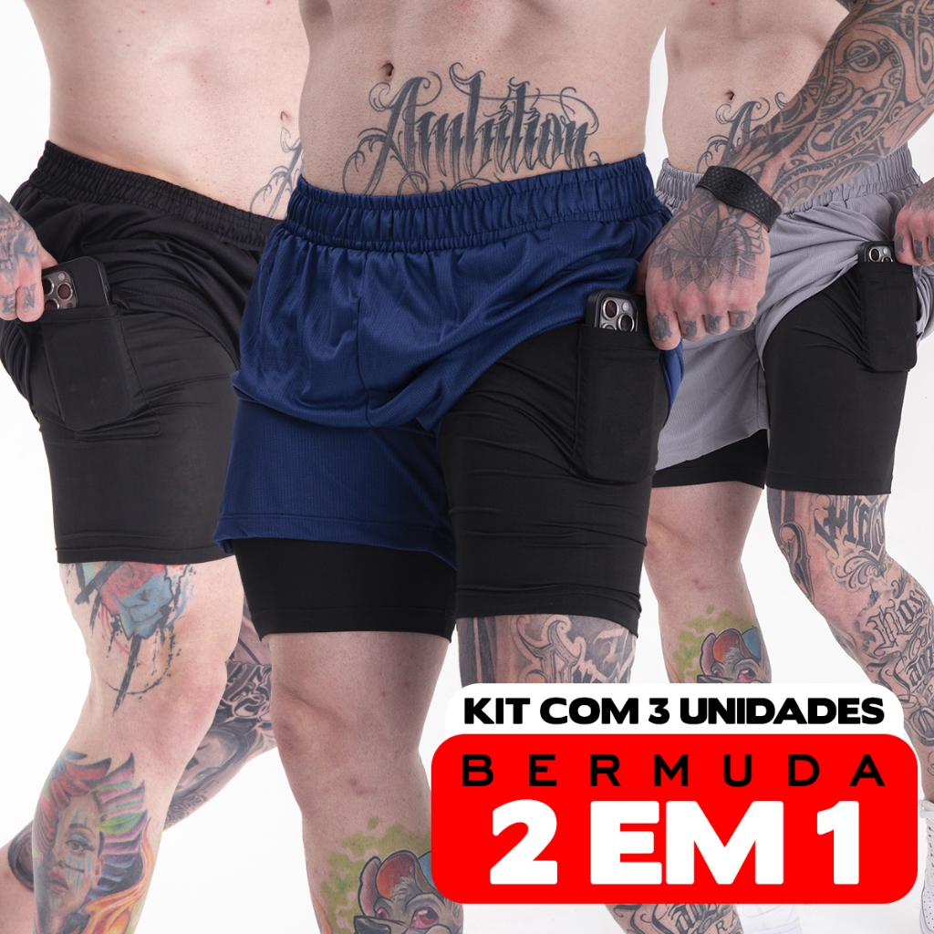 Kit 3 Shorts Para Academia Bermuda 2 em 1 Forrados Com Bolso Extra Original