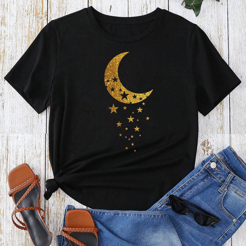Gold Moon and Stars print Moda Nova Camiseta Branca Feminina Manga Curta Preta top Pink Spring/Summer Roupa Dia Dos Namorados Presente De Namorada