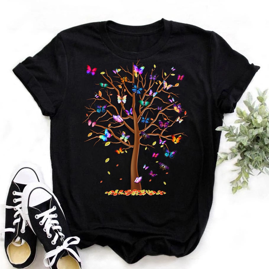 Nova Moda Feminina Camisa De Borboleta Estampada Em t-shirt De Manga Curta De Verão Branca Preta