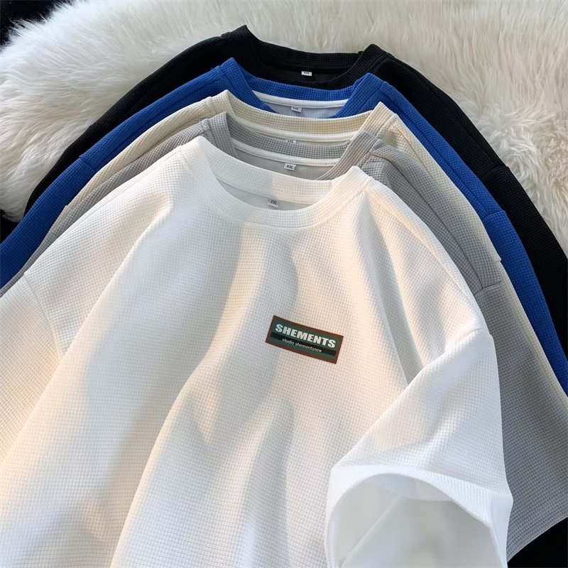 Moda Nova Camiseta Masculina Tendência De Desgaste Masculino waffle Desenho Gráfico Pequeno Manga Curta Solta De Tamanho Exagerado Pescoço Redondo Liso Casal Branca Preta tops