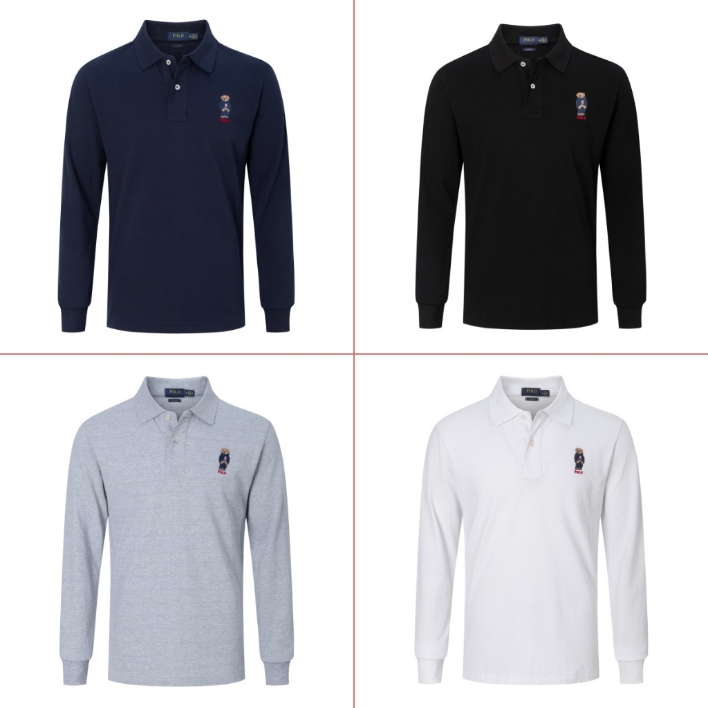 Pequeno Urso Masculino Manga Comprida Gola Flip Camisa Polo Cinco Cores Bordado Cor Sólida Algodão casual Topo