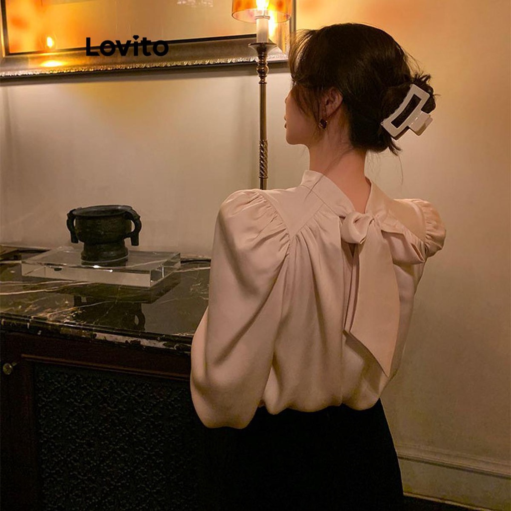 Lovito Casual Blusa Feminina Lisa com Laço Traseiro LNE37392 (Champanhe)