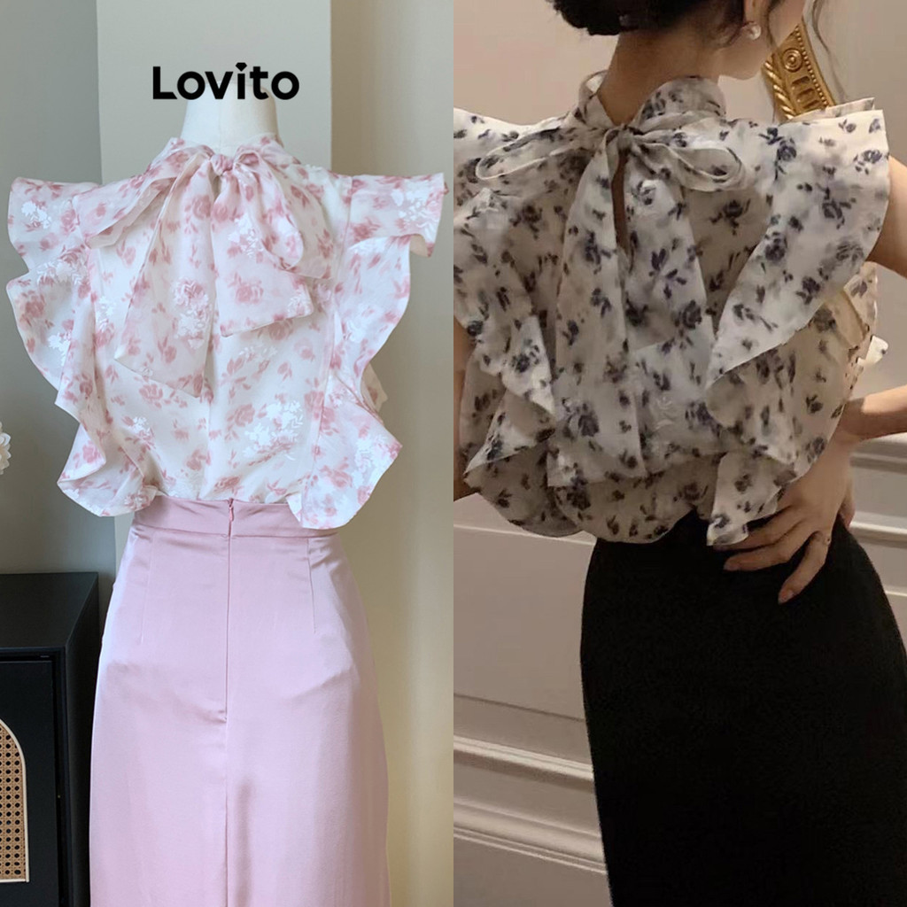 Lovito Casual Blusa Feminina Floral com Babados e Laço Traseiro LNA43026