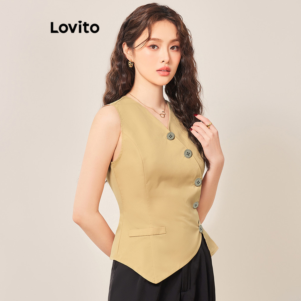 Lovito Casual Blusa Feminina Lisa com Botão e Bainha de Babados L70AD033 (Cáqui)
