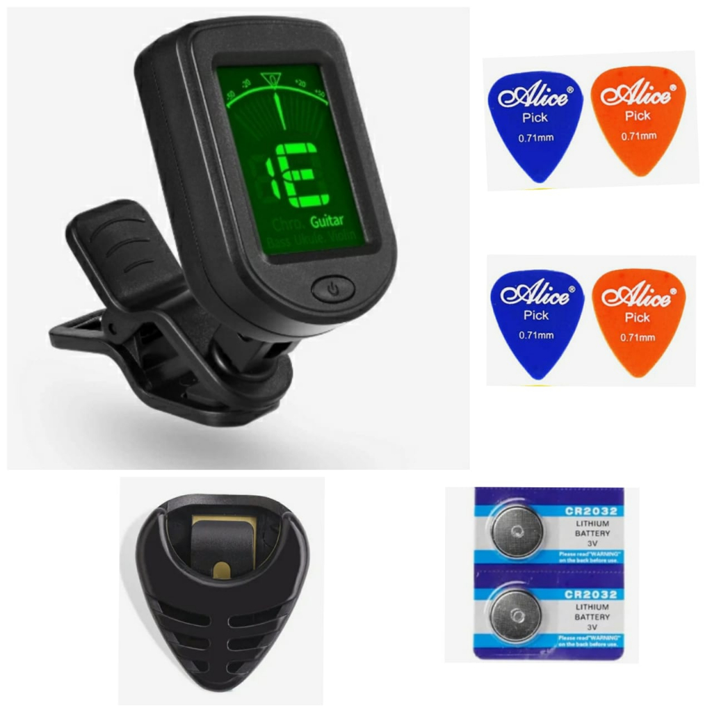 kit afinador violâo 4 palhetas 1 porta palhetas 2 pilhas