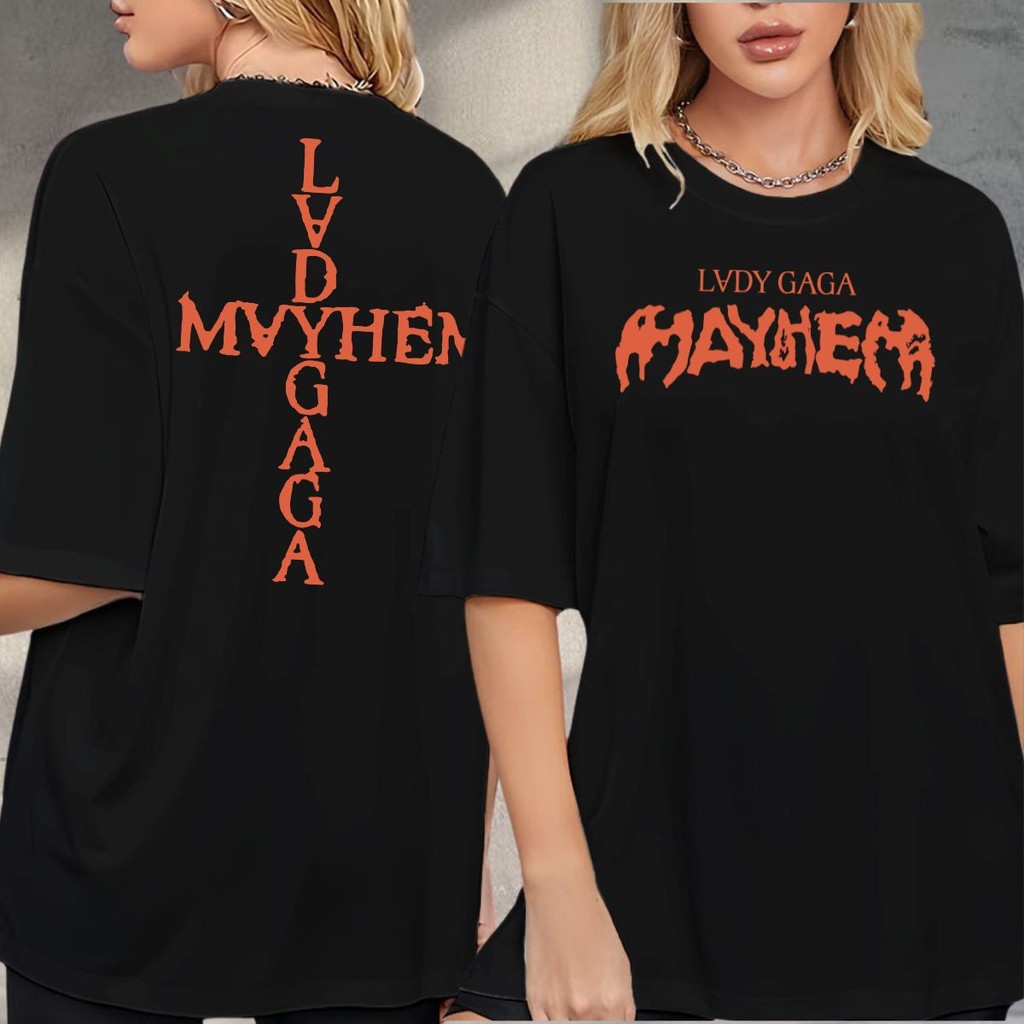 Camiseta Algodão Tshirt Unissex Lady Gaga Mayhem Álbum Show Rio 2025 Frente e costas