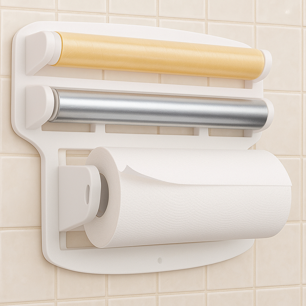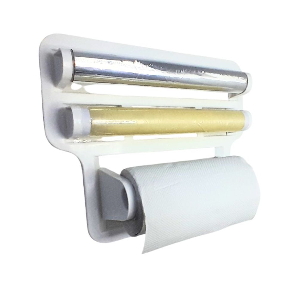 Suporte Triplo Porta Rolos 3 em 1 Cozinha – Papel Toalha, Alumínio e Filme Plástico